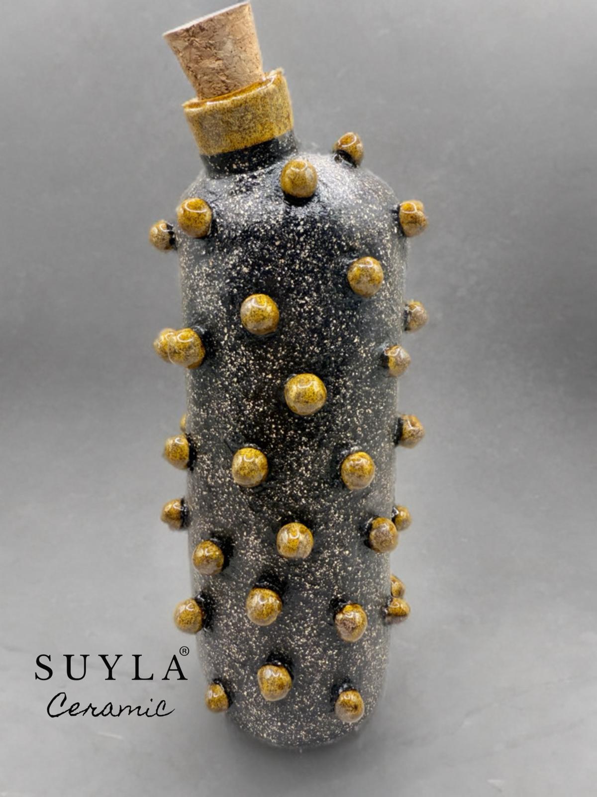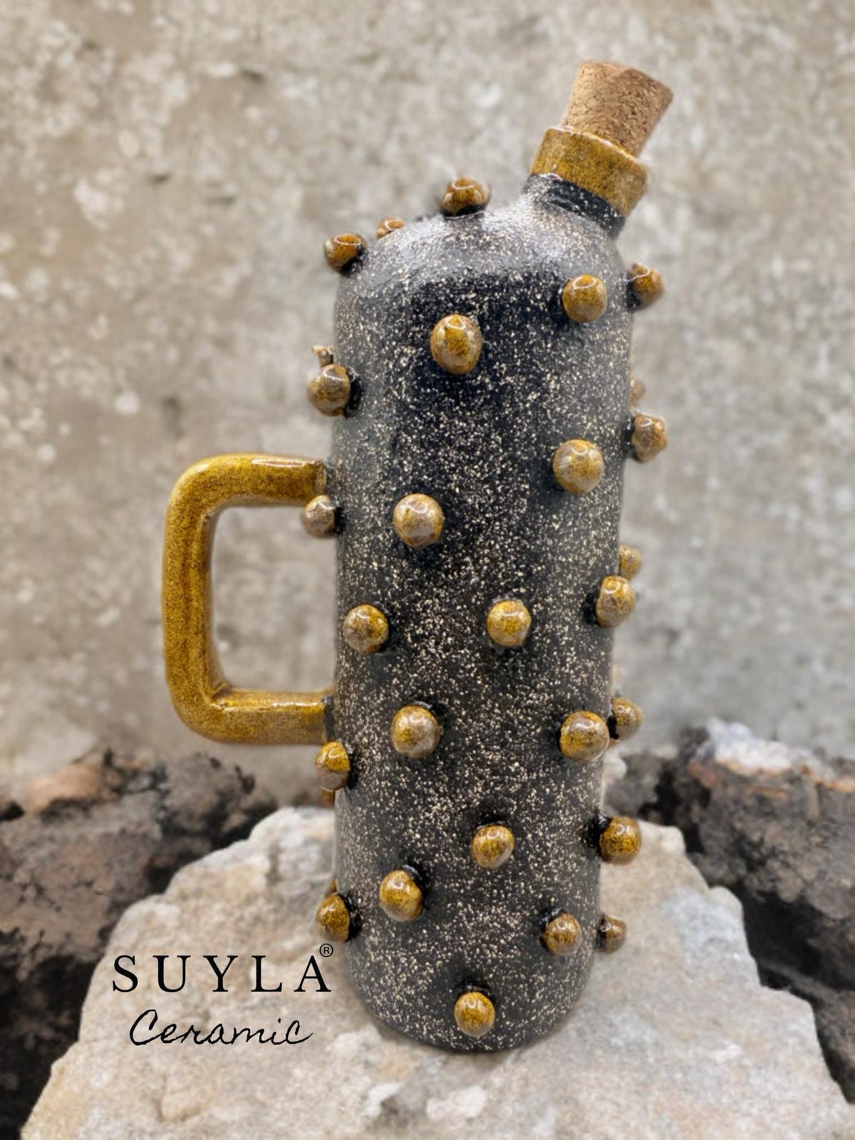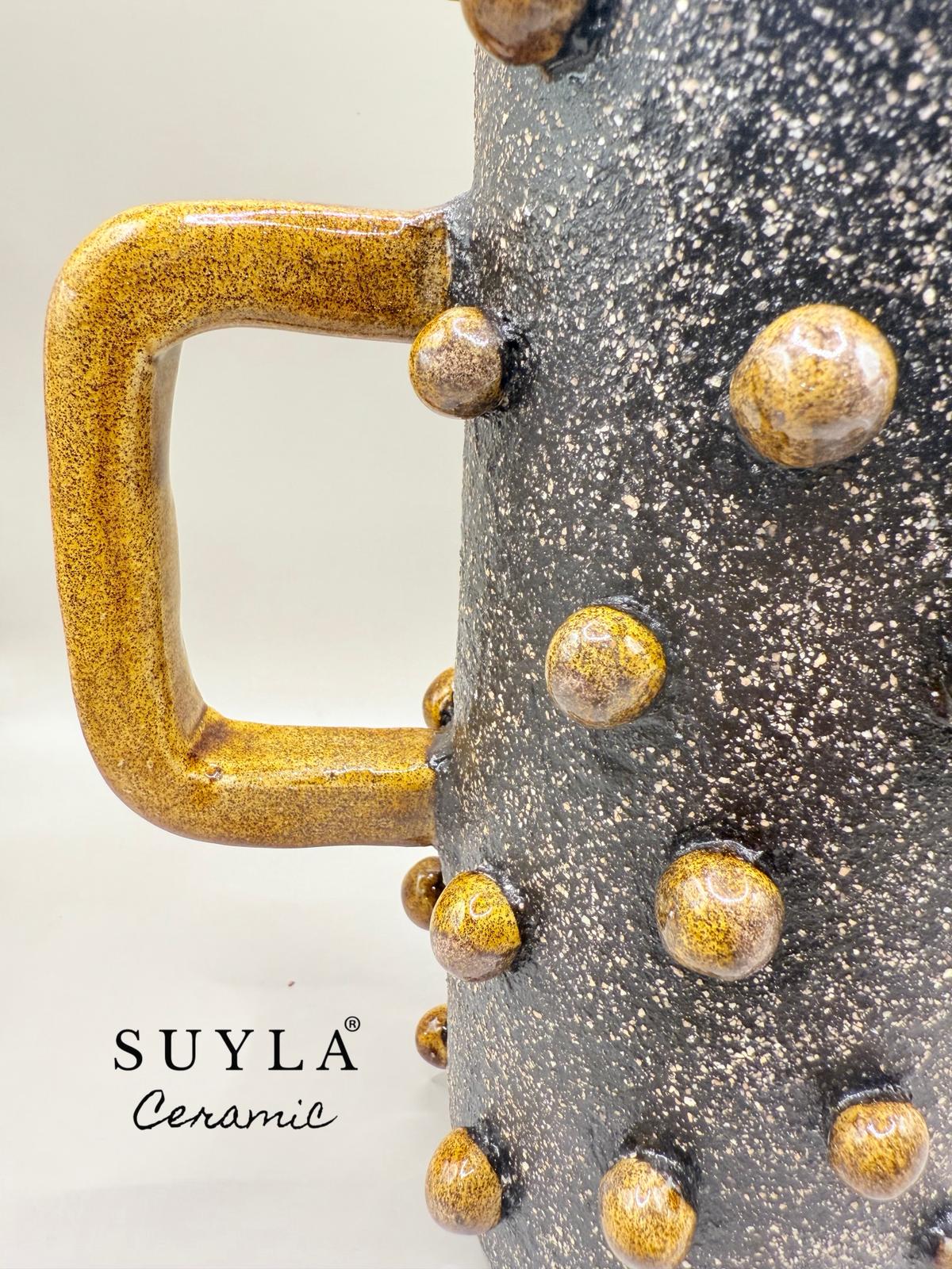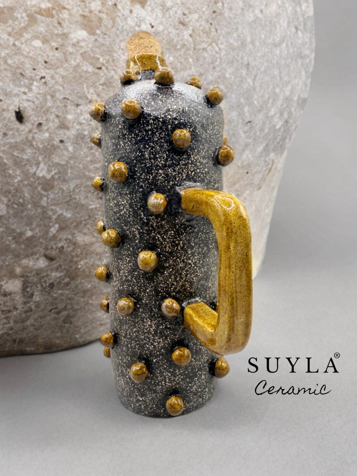 Gövdesindeki granit görünümlü sır mat ve simlidir. Üzerindeki sarı renkli kulp ve toplar kendinden simlidir.